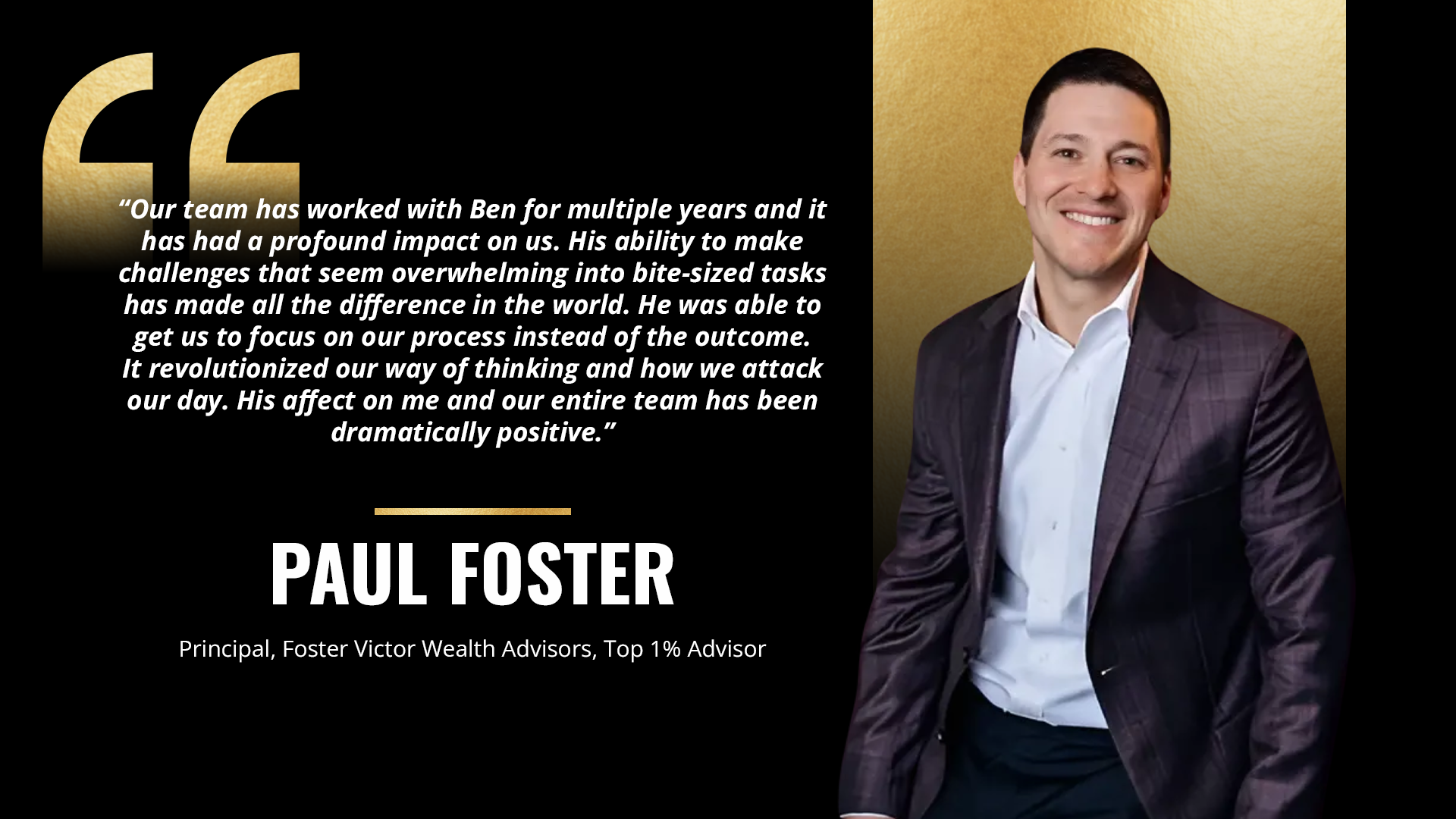 Our team has worked with Ben for multiple years, and it has had a profound impact on us. His ability to make challenges that seem overwhelming into bite-sized tasks has made all the difference in the world. He was able to get us to focus on our process instead of the outcome. It revolutionized our way of thinking and how we attack our day.
